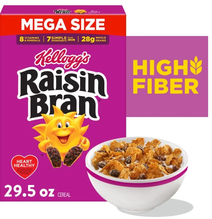 Kellogg’s Raisin Bran Breakfast Cereal, High Fiber, 28g Whole Grain, Mega Size