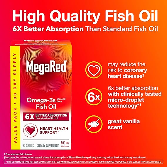 MegaRed Advanced 6X Better Absorption 800mg Omega-3s is clinically proven to absorb 6 times better in your body than standard fish oil, increasing your Omega-3 levels for the support of vital health areas of your heart, joints, brain, and eyes. Each softgel packs 800mg of omega 3 power in a proprietary fish oil blend, and contains 476mg of EPA/DHA.٭ ٭THESE STATEMENTS HAVE NOT BEEN EVALUATED BY THE FOOD AND DRUG ADMINISTRATION. THIS PRODUCT IS NOT INTENDED TO DIAGNOSE, TREAT, CURE OR PREVENT ANY DISEASE.