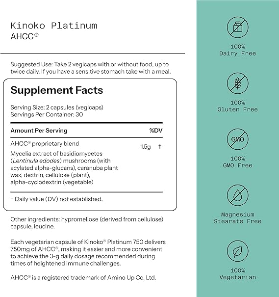 • SUPPORTS IMMUNE HEALTH, LONGEVITY & NK CELL ACTIVITY: Kinoko Platinum AHCC capsules have shown to support immune health, enhance cytokine production, promote macrophage activity, T-cell and NK cell activity and longevity.